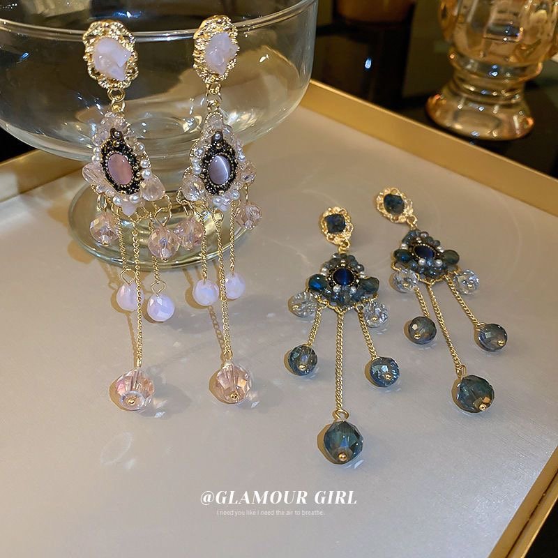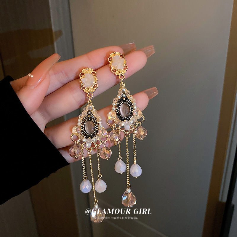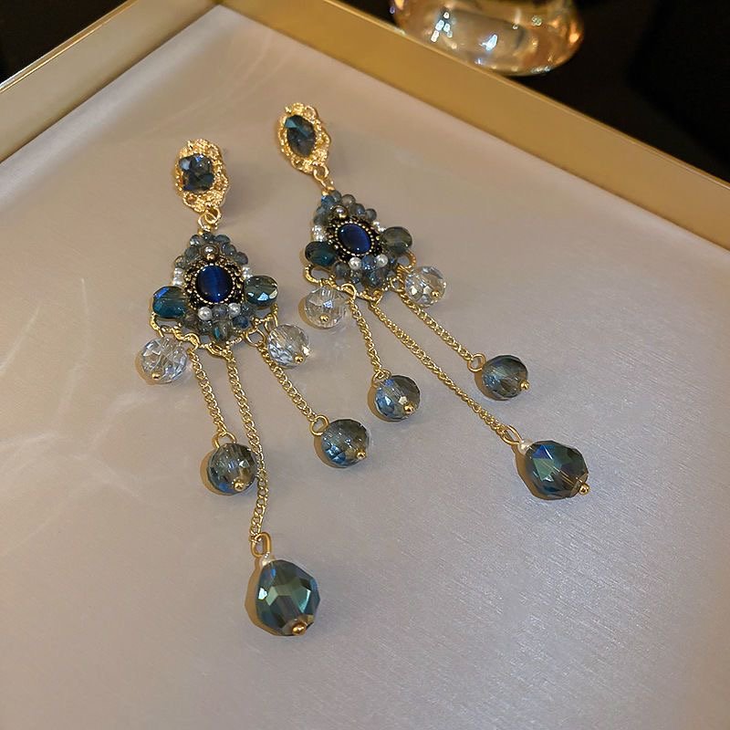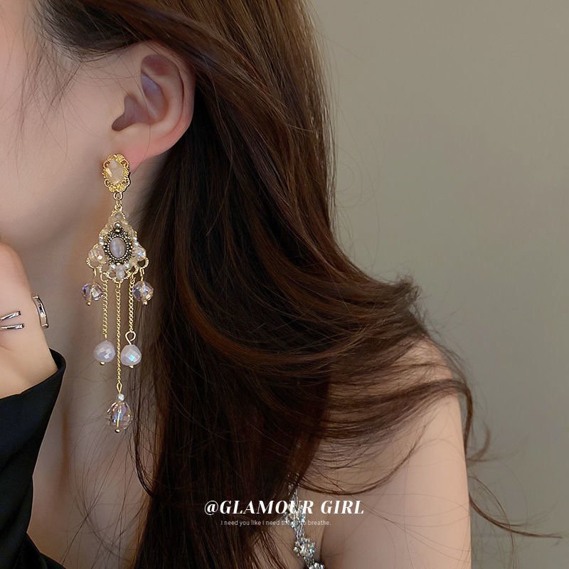 French design sense of silver needle crystal tassel earrings quantity
