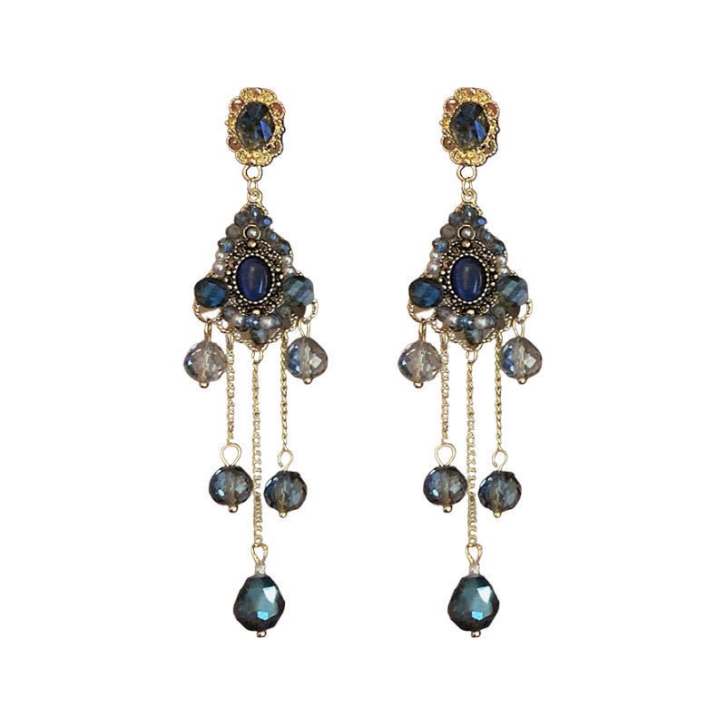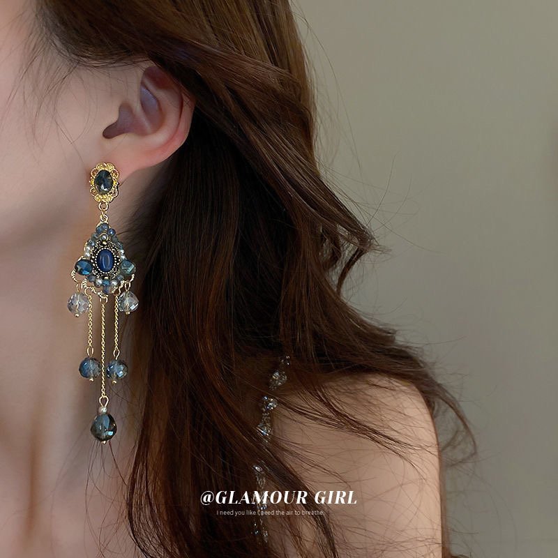 Silver needle dark blue diamond earrings retro